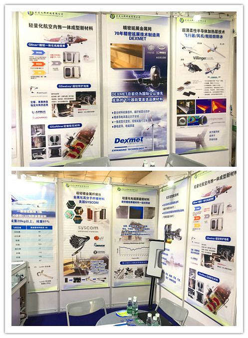 本次北京SAMPE材料展,大連義邦以航空新材料為定位,優選國際領先、國內空白的高精尖多款高性能材料,如用于航天線纜的SYSCOM超輕金屬化高分子纖維絲,飛行器雷擊防護的DEXMET精密延展金屬網、防除冰半導體柔性加熱層、引領國際先進直升機機型的輕量化一體式機艙內飾壁板、地板,高屏效輕量化整艙電磁屏蔽材料、航發高溫防腐涂料等。